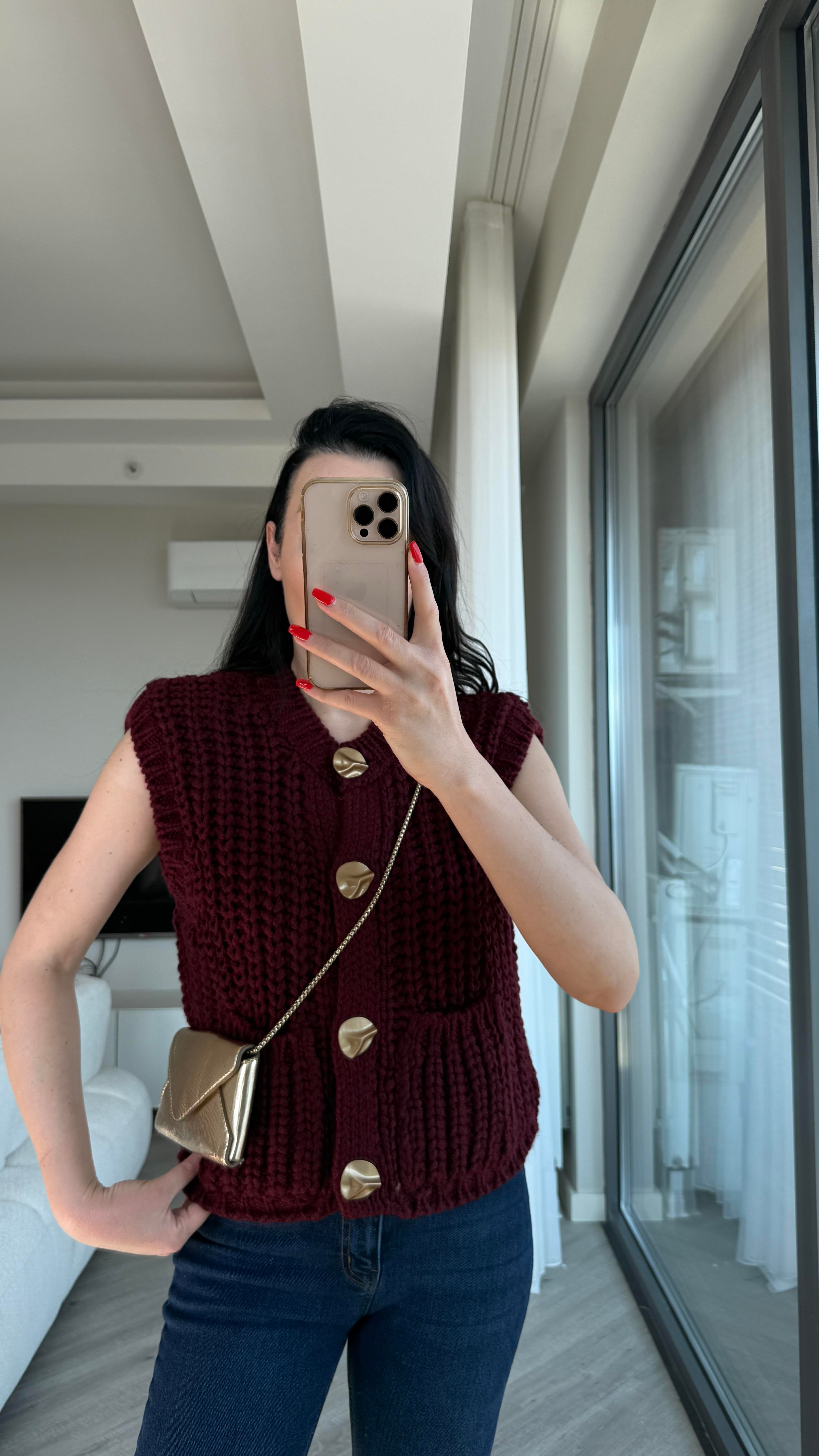 Bordo Örgü Gold Düğme Detaylı Yelek (005775)